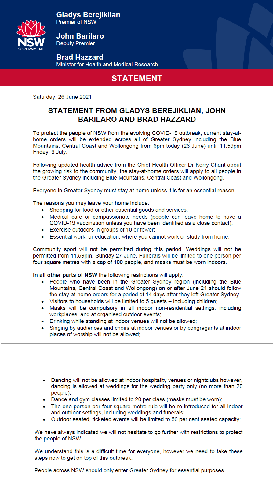 This page is no longer being updated. The premier announced a tightening of restrictions for greater sydney, including the central coast, blue mountains, wollongong and shellharbour. Outdoor public gatherings limited to two people (excluding members of the same. 2 days ago · summary of restrictions stay at home orders apply to greater sydney including the blue mountains, central coast, wollongong and shellharbour local government areas. The number of new cases on tuesday was just one higher than the previous day, but ms berejiklian warned numbers could spike in the next few days. Advice for families help and support Feb 15, 2021 · australia's state by state covid restrictions and coronavirus lockdown rules explained this article is more than 5 months old. Nsw lockdown rules may be too 'soft' and could see restrictions extended. Jun 26, 2021 · greater sydney, the central coast, the blue mountains and wollongong will all be under lockdown restrictions from 6pm today for two weeks.